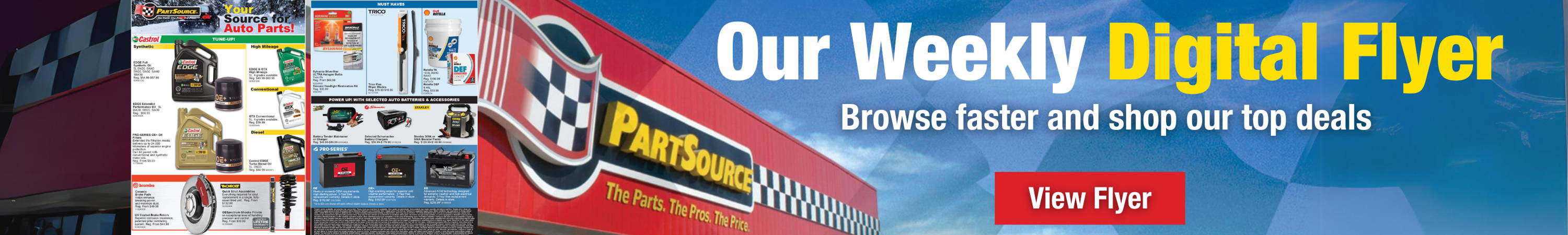 Product, service availability, and selection may vary by store. Please check your local store for availability. Sizes quoted are approximate. Some products may require assembly and delivery lead time. Regular prices shown are PartSource’s regular prices at which the products will be offered by PartSource as of October 2025. Regular prices in the flyer are PartSource’s suggested regular prices. Market conditions may cause prices to change without notice. Certain items may be subject to additional fees, or charges including environmental handling or disposal fees, which may vary by Province. For certain promotional items such as but not limited to hot buys, special buys, clearance and seasonal items and bonus with purchase items, shop early for best selection as no rainchecks or substitutes will be given. We reserve the right to limit quantities, to correct typographical, illustrative or pricing errors, and unless otherwise indicated, to offer substitute equivalent products, where advertised products are unavailable or in the event of advertising errors. Price Match Guarantee: PartSource will match any local competitor’s regular or advertised in-store Canadian retail price on an identical in-stock item at checkout or within thirty (30) days of purchase at a PartSource store. PartSource will only price match competitor brick and mortar retail locations that are within a radius of 20km from where price match is being requested within Canada. PartSource will not price match items which are the subject of typographical or advertising errors or misprints (e.g. Impact Wrench for $1.99), offers which require the purchase of more than one item or items which are the subject of free offers with the purchase of an additional product (e.g. Buy One Get One Sales), credit/financing program offers by competitors, items where price is only available when purchased using a proprietary form of payment (e.g. 10% discount when using competitor’s credit card), items where price is only available as part of a loyalty program, clearance sales after purchase, during special sales events (e.g. Black Friday, Cyber Monday), bankruptcy, clearance, or liquidation sales or any other sale where quantities are limited, used, damaged, refurbished, returned, open box or display merchandise, items from wholesale distributors or sales which are not available to the general public, scratch and save discounts or items which are the subject of mail in rebates, discounts offered for volume purchases in excess of average consumer end use, discounts or any other type of promotional offer made available by any party in connection with the sale of gift cards, ‘Spend and Get’ sales (e.g. Spend $200, get $20 gift card), discounts, gift certificates, coupons or credits of any kind offered by coupon issuers not actually providing the product or service, emergency automotive parts sourced from third parties, online only retailers based outside of Canada, or brick and mortar retail locations outside of Canada. The item must be identical, including the product features, applicable warranty, manufacturer, model number and size/volume. Whether or not an item is “identical” or from a “local competitor” is determined by the store at their discretion. PartSource’s price match guarantee may be modified or withdrawn at any time without notice. Quantities can be limited at the discretion of the store. Offers are while quantities last, no rainchecks will be given. 1Bonus wiper blade installation and windshield washer fluid top-up is only available with the purchase of a pair of new wiper blades at PartSource. Installation applies only to standard wiper blade installations that are compatible with the vehicle. Standard installation does not apply to oversized vehicles and/or vehicles requiring specialty installation. Windshield washer fluid may vary by store, and will be provided up to a maximum of 3.78L per vehicle. Subject to availability of store staff. See in-store for details. PartSource name, logos and trademarks are owned by Canadian Tire Corporation, Limited. All rights reserved.