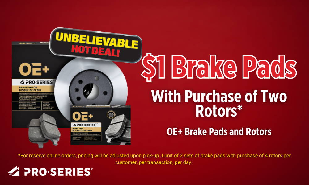*Limit of 2 sets of brake pads with purchase of 4 rotors per customer, per transaction, per day. Brake Pads must be of equal or lesser value than the Rotors and must be for the same vehicle. Upon return of the qualifying brake rotor purchase, brake pads must be surrendered, or the regular price of the brake pads will be deducted from the refund amount. Regular price applies if bought separately. Valid for retail customers only.