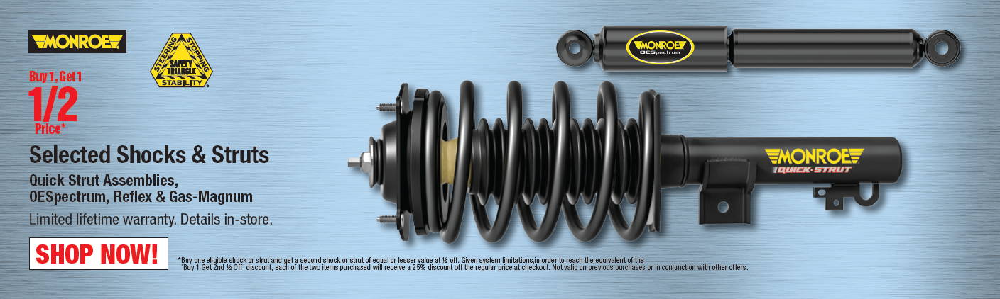 *Buy one eligible shock or strut and get a second shock or strut of equal or lesser value at ½ off. Given system limitations, in order to reach the equivalent of the ‘Buy 1 Get 2nd ½ Off’ discount, each of the two items purchased will receive 25% discount off the regular price at checkout. Not valid on previous purchases or in conjunction with other offers.